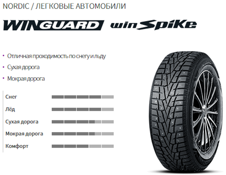Высокотехнологичный вариант зимней резины, параметры которого идеально подходят для использования в зимний сезон. Езда по снегу, льду и слякоти для Roadstone Winguard WinSpike не проблема. Блоки V-образного протектора имеют жёсткую структуру, благодаря чему обеспечивается эффективное сцепление с заснеженными трассами. Данная модель разработана в 2011 году.